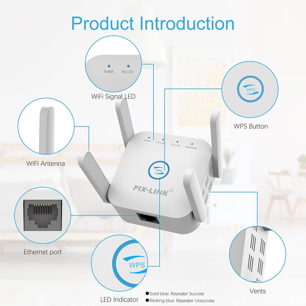 PIX-LINK LV-AC24– ретранслятор WiFi (2.4-5GHz) сигналу, успішна робота якого дозволяє отримати якісне бездротове покриття (до 50 метрів на вулиці та до 30 метрів у приміщенні) на території великого приватного будинку, офісної будівлі, за винятком появи мертвих зон. З Ethernet-портом на борту цей прилад експлуатується як бездротовий адаптер для підключення провідної техніки.
