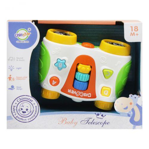 Цікава іграшка у вигляді бінокля. Оснащена підсвіткою і звуковими ефектами: A - різні мелодії, B - звуки природи, C - звуки тварин і D - мультяшні звуки. Також у бінокля є рухливі детальки, які сприяють розвитку дрібної моторики. Іграшка виконана у вигляді бінокля, але подивитися в нього не можна. Виготовлена з якісних і безпечних матеріалів. Працює на батарейках (не йдуть в комплекті). Для малюків від 18-ти місяців.